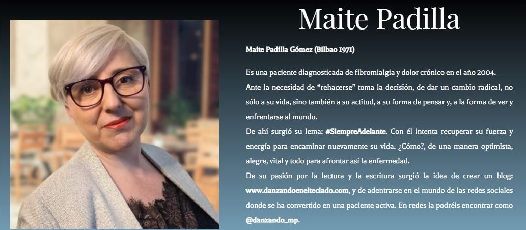 MAITE PADILLA: Creo que todos pueden aprender de la Fibromialgia y el dolor crónico; los pacientes pueden ver que no están solos, que sus problemas, limitaciones, pérdidas, son las mías, son las mismas que las de otro paciente. Por otro lado, también pueden sacar enseñanzas, ideas para sobrellevar el dolor, para replantearse su forma de ver el dolor, la enfermedad, la vida y, por supuesto, la forma de verse ellos mismos, para hacer de ellos el centro de sus vidas y poner a la enfermedad en el lugar que le corresponde, que no es ese centro. La enfermedad es algo que tenemos, que sufrimos, pero no nos define.